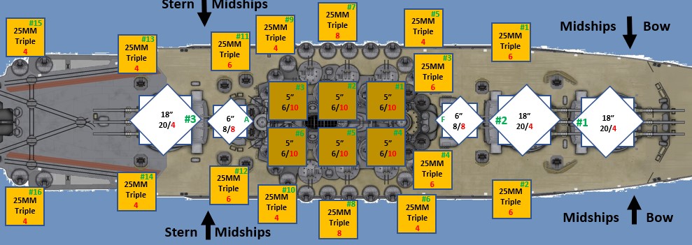 Greg: The Yamato went through several armament upgrades throughout the war, but the final 1945 configuration included an astonishing 150+ 25mm AA guns in triple mounts. Sadly the 25mm triple mounts proved to be not very effective. There were also six six-inch guns in two triple mounts, one fore and one aft. Probably the best AA defenses were the twelve 5″ guns in twin high-angle mounts, three per side. The nine 18″ main guns, in three triple batteries, were of very limited use but actually had a “beehive” incendiary round that was used for AA purposes. The game amalgamates a lot of the 25mm triple mounts into groupings, in order to keep things playable.