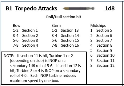 Greg: Curiously enough this is my first design to require eight-sided dice. Torpedo damage occurs by section of the ship, and this turned out to be four, eight, and four sections per side. Therefore eight-sided dice were perfect for that. The twenty-sided die is used to determine what portion of the AA guns the American Strafing Attacks will target. The other attacks and damage worked out better with standard six-sided dice, so those need to be used as well.
