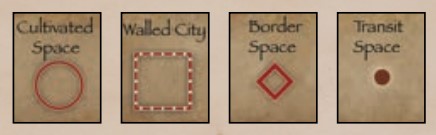 There are a lot of icons that are used on the board to identify specific types of locations including Cultivated Areas, Walled Cities, Border Spaces and Transit Spaces. These are typically fairly easy to identify on the board as the symbols are large and there really are not that many other shapes on the boards aside from borders, roads and other connections. I like the use of these symbols on the board as it does make for a quick and easy means of identifying the different types of spaces and aids in the planning for the players.