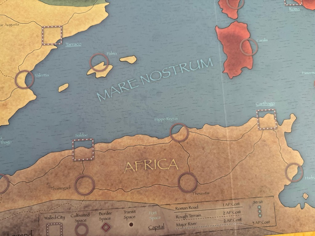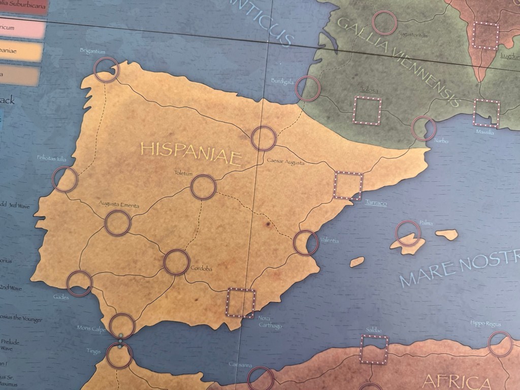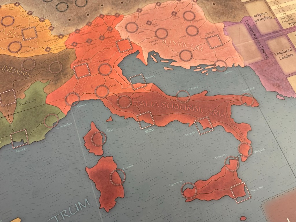 The board is a 22″x34″ mounted mapboard and covers the entirety of the Western Roman Empire with each of the spaces representing one of the politically or militarily important locations. These spaces are furthered grouped into the different provinces of the Empire which were eventually