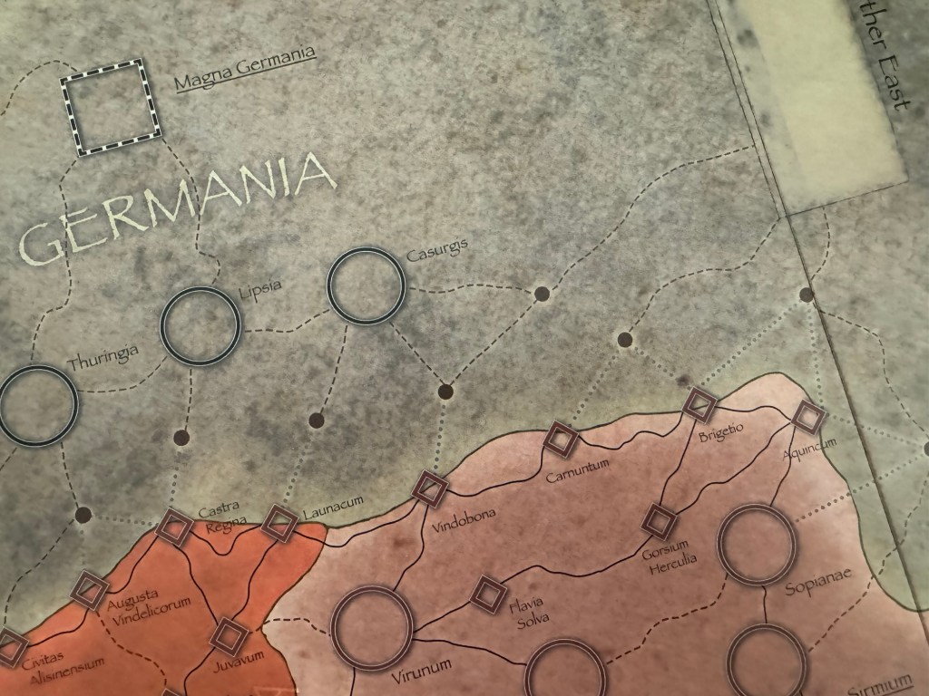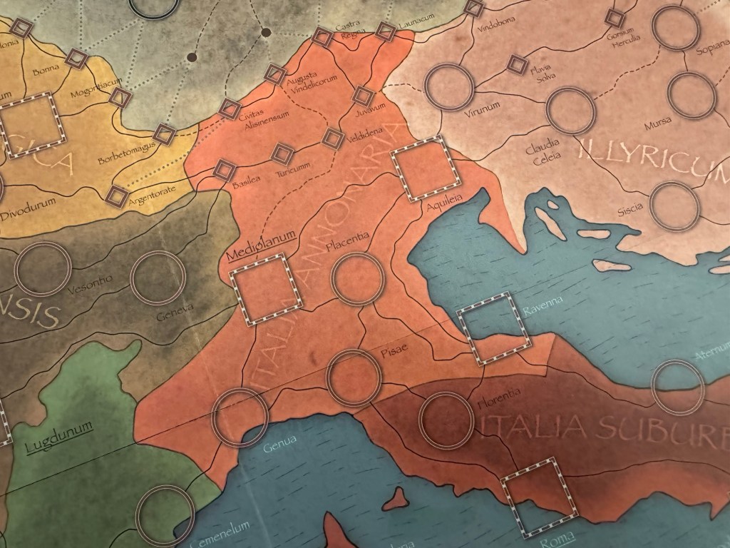 In northern Italy or Italia Annonaria are a great line of fortifications that are doubled up in depth to prevent a free pass into Italy. There are also a triangle of 3 Walled Cities in Mediularium, Aquileia and Ravenna. This spacing and layout of the north are intentional to dissuade the invaders from attempting to come into the borders of the imperial city. But, in the game there is also the real threat of pretenders who will appear based on Event Cards and can be a real menace to the Romany player.
