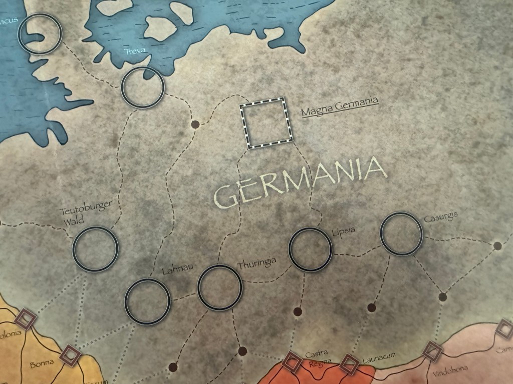 The circles that are laid out around Magna Germania are the Cultivated and civilized parts of the kingdom and the points from which the invaders will stage their various invasions. These Cultivated Spaces include such names as Treva, Teutoburger Wald, Lahnau, Thuringia, Lipsia and Casurgis. You will also notice that there are fortifications shown on the border with the diamond shapes. These are the Castra and Colonia that were built by the Romans to repel the invaders and will be a main focus of the game over the first few rounds as they Barbarians will pick and choose their routes and attack with impunity hoping to break through and cause havoc for the limited Roman defenders. Some of the spaces will have to contend with several different points of egress and these will be the hot spots including spaces such as Castra Regina, Civitas Alisinensium and Augusta Vindelicorum in the center of the border areas.