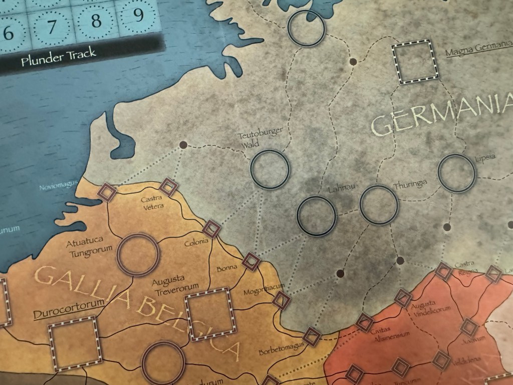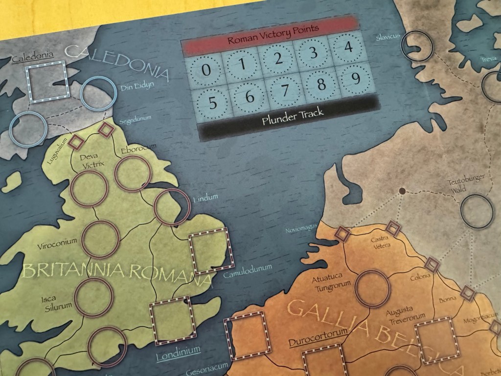Caledonia is back to the mottled gray color as this is Barbarian territory and Hadrian’s Wall acts as a border here with a few fortifications at Segedunum and Luguvalium. To the right of Caledonia is the Plunder Track and Roman Victory Points Track.