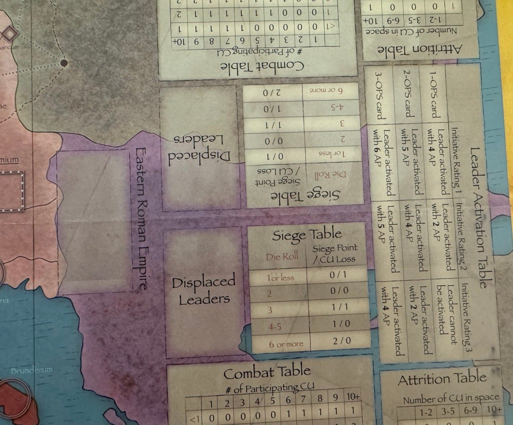 As I always say in these pieces, a good board is more than just the art and I always measure how helpful they are in actually playing the game. Barbarians at the Gates has lots of player aids printed directly on the board on the right hand side including the Combat Table, Attrition Table and Siege Table as well as the Leader Activation Table. There are also large boxes for Displaced Leaders and having this all in the same area and also having the same information on each side of the board caters to both players. There is not a bad seat in the house and both players can situate themselves to take advantage of these helpful aids.