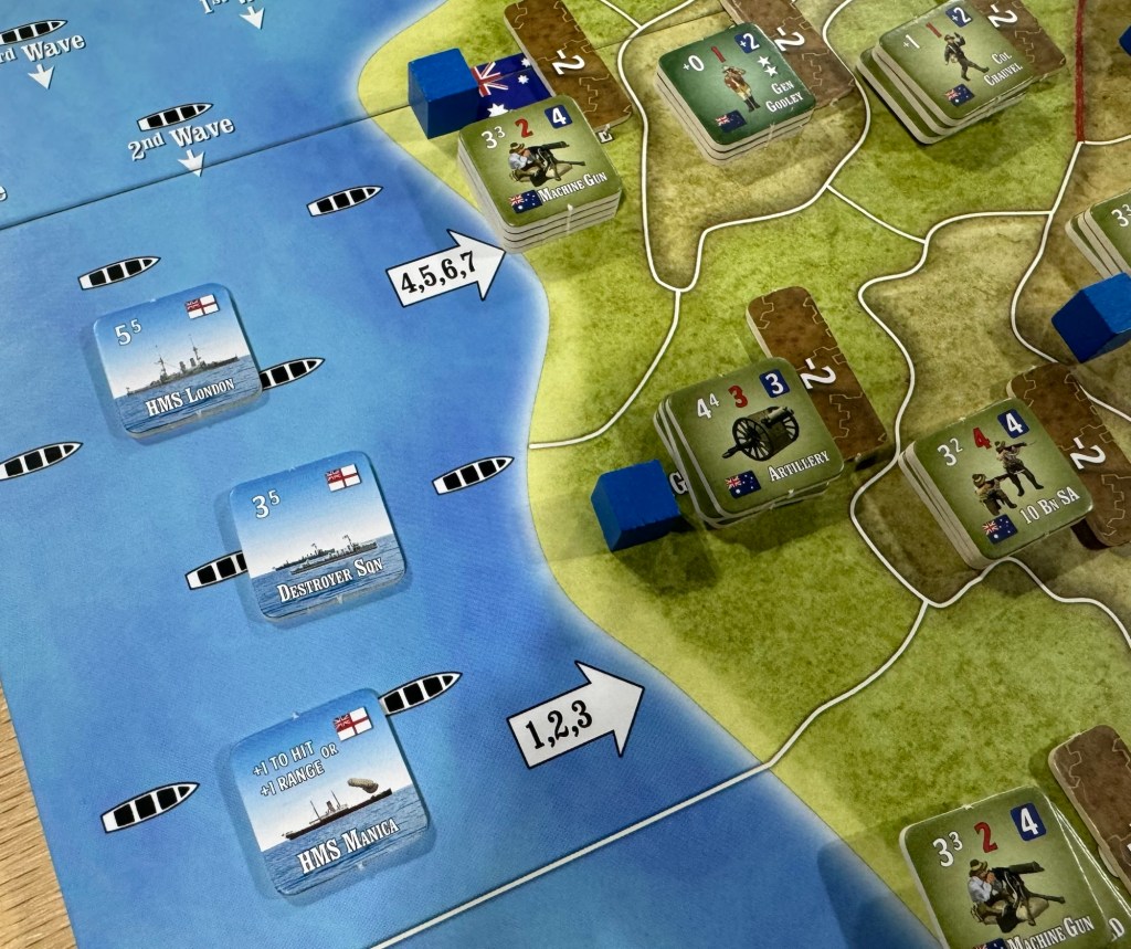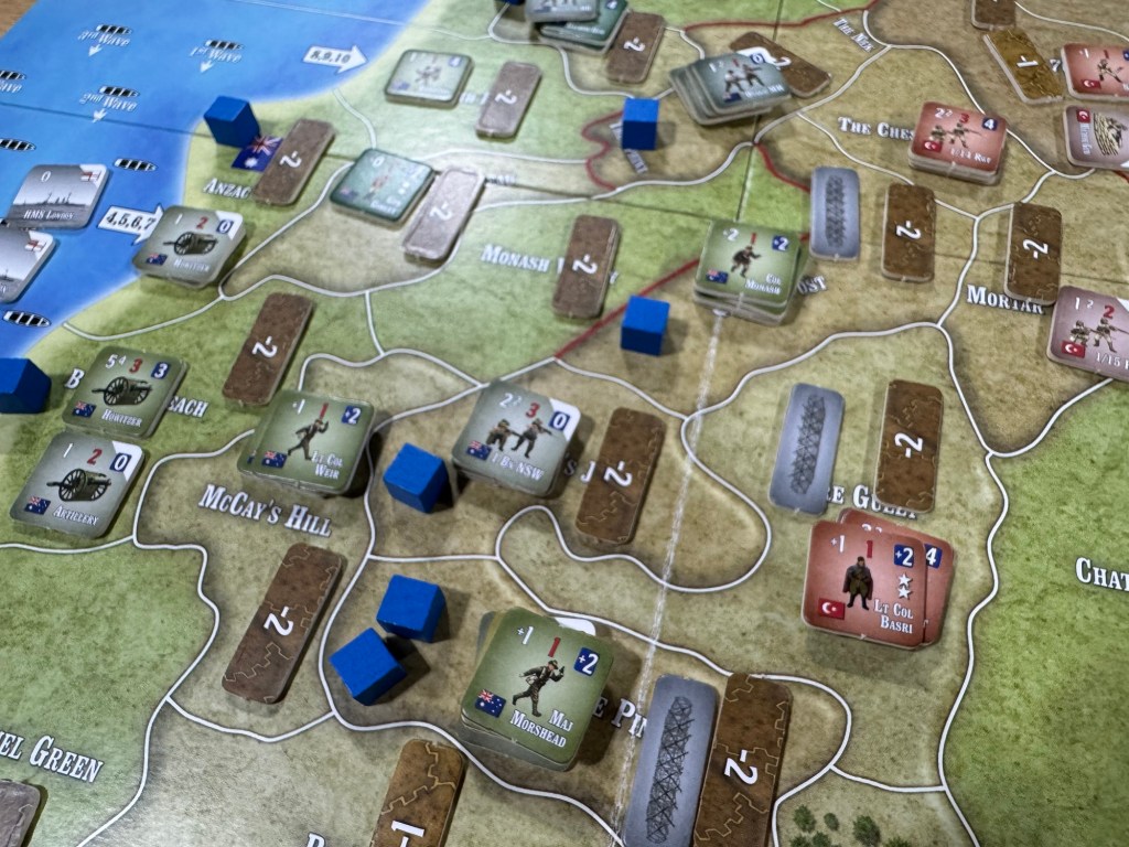 What I would say straight asway is that most WWI wargames are high level strategic or operational level games that don’t really deal with the strategies and tactics used in the actual battles of the period and are more abstract and don’t focus on the minutiae of the battles. Assault on Gallipoli though focuses on the gritty details of the period and includes a large focus on the hand to hand combat in the desperate bayonet charges, the constant threat of being shot by a sniper, the rugged terrain and how it hampers movement, the presence of trenches as well as barbed wire that make direct attacks much more difficult and the use of artillery and off shore bombardments to soften up targets before going over the top. I really very much enjoyed the focus of this design and want to share my thoughts in this First Impressions style post.