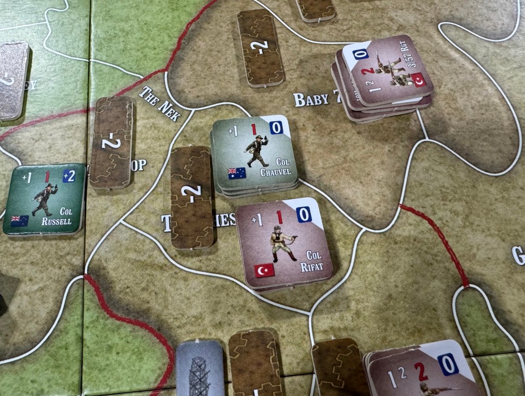 The number of Close Combat Cards is determined by a few factors including the total Firepower of all Units involved, extra +1 or +2 cards for Leaders present and +1 card for Shallow trenches and +2 for Deep trenches for the defender. This will result in a number of cards between 3-8 and means that these Close Combats can take a few plays to resolve but it is pretty easy to adjudicate and doesn’t take that much more time than rolling dice. I frankly love this system and feel like it was a good representation of this brutal hand to hand combat that doesn’t rely on dice luck but cards (and the associated card draw luck I realize). I really like thinking about the odds of the other player having the cards I am considering playing based on the knowledge of the makeup of the deck. There is a good amount of tension with this method as well and I really like the way it works. It is somewhat of a mini-game within the game and that is fine by me. I can see where some would think that this was just added in because the designers liked it but I do feel that it has a thematic connection to the grim nature of the fighting at Gallipoli.