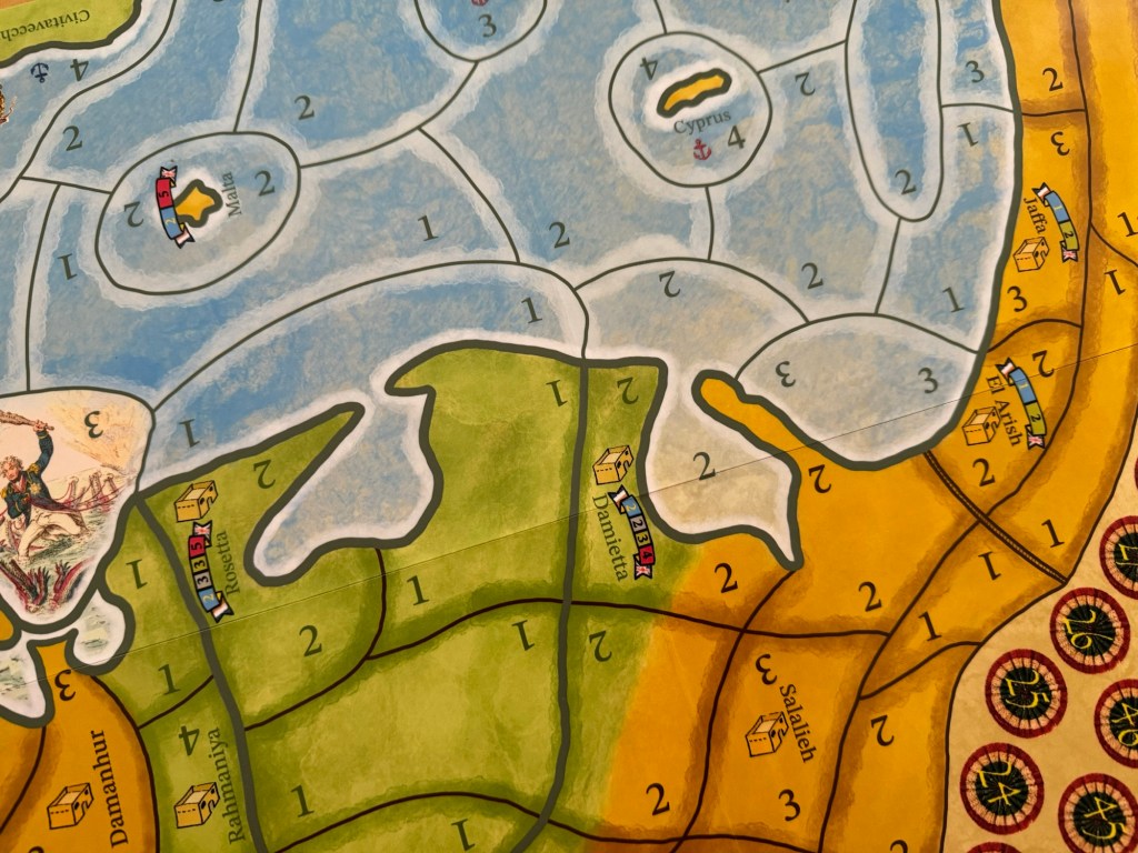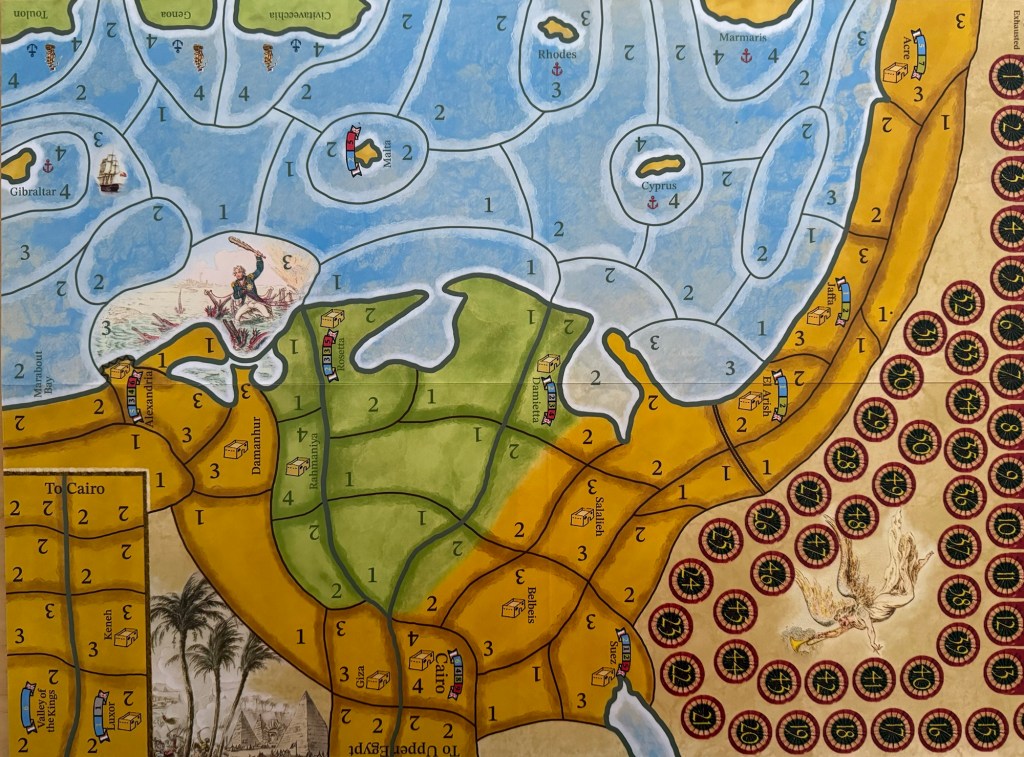 One other focus of the board is the crossing of the French fleets across the Mediterranean Sea. You will notice that there are French Fleets dawn in spaces adjacent to the Italian ports of Toulon, Genoa and Civitavecchia. The ports are identified with the black anchor symbols. Notice that these spaces all have a value of 4 printed in them so it is very easy for the French to leave these ports and get out into the sea and on their way to mainland Egypt and Syria. But, once they hit open water, the trip gets much harder with values of 1 and 2 for the most part. Also in the area is Lord Nelson’s fleet anchored off the space in Gibraltar. They are awaiting the French fleets and must chase them down to identify which of the 3 fleets are the real fleet carrying Emperor Napoleon and his armies. If Lord Nelson catches the correct fleet, it will not be destroyed, but will then make it to Egypt with less troops than if they had made it cleanly. This is a very interesting aspect of the game as it a bit of cat-and-mouse that takes just a few turns to adjudicate but can make a pretty significant difference in the power that Napoleon will arrive on the mainland with to go campaigning.