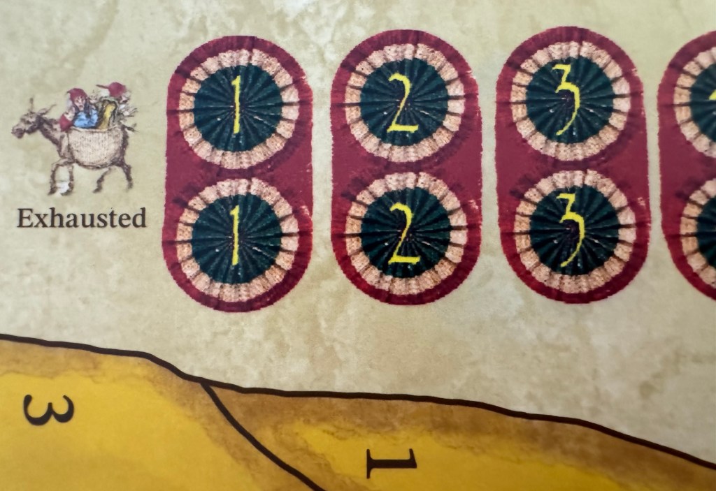 You will notice that the values on the spaces are not random and represent the conditions of the spaces, their connections, terrain and other aspects that would effect the movement of troops. Low numbers can represent areas of desert that were hard to move through due to lack of water or large distances of ocean that took a long time to cross and were susceptible to storms or windy conditions. Higher space values represent a better ability to move through those areas due to less severe or flat terrain, overall smaller distances or even more accessibility to forage and supplies for the troops.