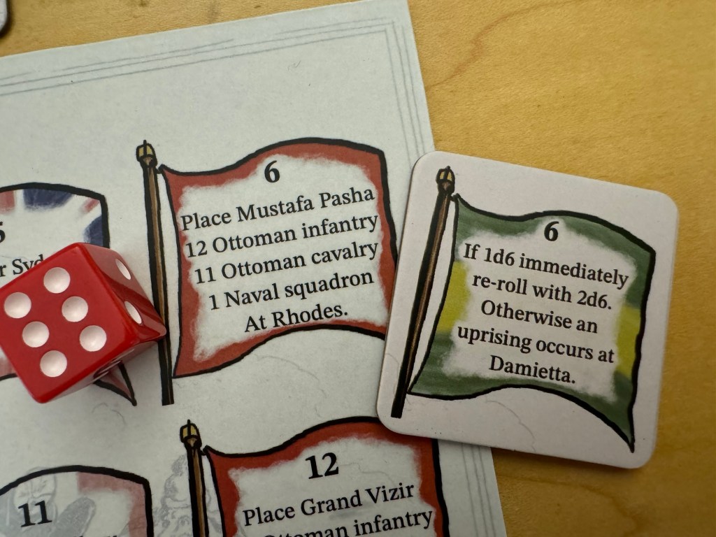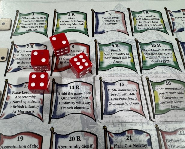 One other thing that will be determined by the roll of the dice and the number of dice to be rolled is the end condition. Once 4d6 are rolled for an event, if a score of 14 is realized then the game will come to an end. According to the designer, this represents “the fact that talks for European peace were progressing at the time, in Amiens, in France and no one in Egypt knew when a boat might arrive from Europe saying that a peace treaty had been signed, meaning fighting had to stop”. I think that this variable end condition really was a nice historically significant addition to the game and really can be frustrating for the player who is behind but is always ever-present as an outcome and something that you need to think about and consider as the game progresses.