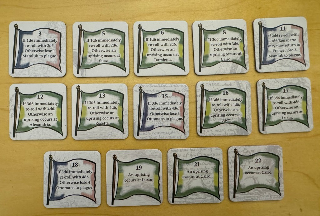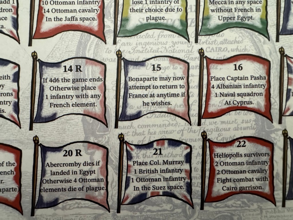 The Event Clock is a separate thick cardboard board that has 24 numbered flags, which each have a different unique event written in the space. The flags are tied to the nations that are involved in the conflict including the French, British, Ottoman and Mamluks and the flag in the space represents which of the nations will benefit from the event. You will notice that there are Event dice markers found along the left edge of each of the rows. The first event of the game is always determined by rolling a single D6 and consulting the Event Clock. Once the first event is determined by this die roll, the players will have to place the one (1) dice marker over the space for it on the left edge of the Event Clock. The number of dice to be used and totaled to decide the event changes from 1 die to up to 4 dice as the game progresses. The two (2), three (3) and four (4) dice markers are placed on their spaces as reminders when the number of dice to be used for the determination changes. This process and the number of dice that are to be rolled can determine what events can be played this game and will eliminate the occurrence of some events. At first, I didn’t really like how this worked but after playing, and then discussing and thinking about the mechanic, it really makes for a very uncertain outcome and can drastically change the fortunes of players. This keeps the game a bit chaotic and also changes the possible outcomes and improves replayability.
