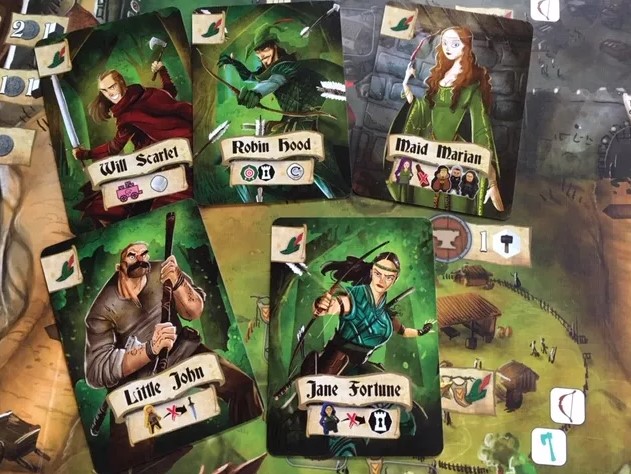 The game is made up of 5 rounds and each round consists of two separate phases called the Merry Men Phase and Hero Phase. In the Merry Men Phase, players will work cooperatively to build and set various traps and ambushes to thin out the enemies on the board. In order to stay one step ahead, players have to send their Merry Men pieces to acquire resources and weapons, and lay traps to catch the Sheriff’s army of guards. Assigning Merry Men is done through playing Merry Men Cards that offer variable actions. Also, the players will have to focus on the various carriages of the Prince who are transporting gold taxed from the surrounding villages and you must build barricades on the roads to prevent the heavily guarded carriages from entering the castle.
