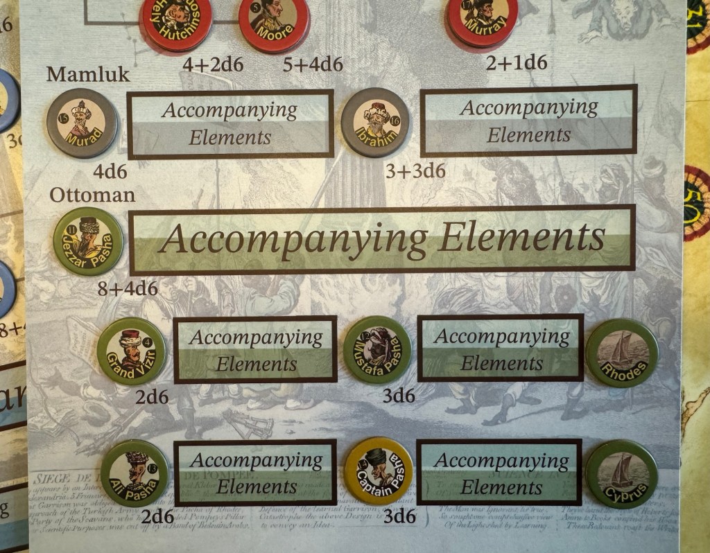 So what is Glory used for in the game? It is a great resource to use to re-roll dice. Keep in mind that using Glory in this way represents a combination of a commander’s historical skill and how lucky they appear to have been in the campaign. As Glory is used up, a commander’s marker is moved down the number track to indicate their reduced rating. A commander’s Glory is reduced to re-roll dice during the game at the rate of one glory point per single re-roll. Any number of dice can be re-rolled once by the owning player and any successful combat dice of an opponent can be required to be re-rolled once. This was one of the parts of the design that was so very interesting. It made the process of combat very difficult for the Allied Command as they Mamluk and Ottoman commander’s Glory Ratings were very low as compared to the French and even the British values are not as goo das the French. And this isn’t necessarily surprising but once concern I had was that the rolls needed to hit for the Allies typically are much harder to come by than for the French. And I know that historically this is accurate based upon the fighting prowess and abilities of the commanders on that side but it did make for a very difficult prospect for the defense of Egypt.