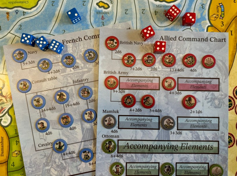 So what is Glory used for in the game? It is a great resource to use to re-roll dice. Keep in mind that using Glory in this way represents a combination of a commander’s historical skill and how lucky they appear to have been in the campaign. As Glory is used up, a commander’s marker is moved down the number track to indicate their reduced rating. A commander’s Glory is reduced to re-roll dice during the game at the rate of one glory point per single re-roll. Any number of dice can be re-rolled once by the owning player and any successful combat dice of an opponent can be required to be re-rolled once. This was one of the parts of the design that was so very interesting. It made the process of combat very difficult for the Allied Command as they Mamluk and Ottoman commander’s Glory Ratings were very low as compared to the French and even the British values are not as goo das the French. And this isn’t necessarily surprising but once concern I had was that the rolls needed to hit for the Allies typically are much harder to come by than for the French. And I know that historically this is accurate based upon the fighting prowess and abilities of the commanders on that side but it did make for a very difficult prospect for the defense of Egypt.