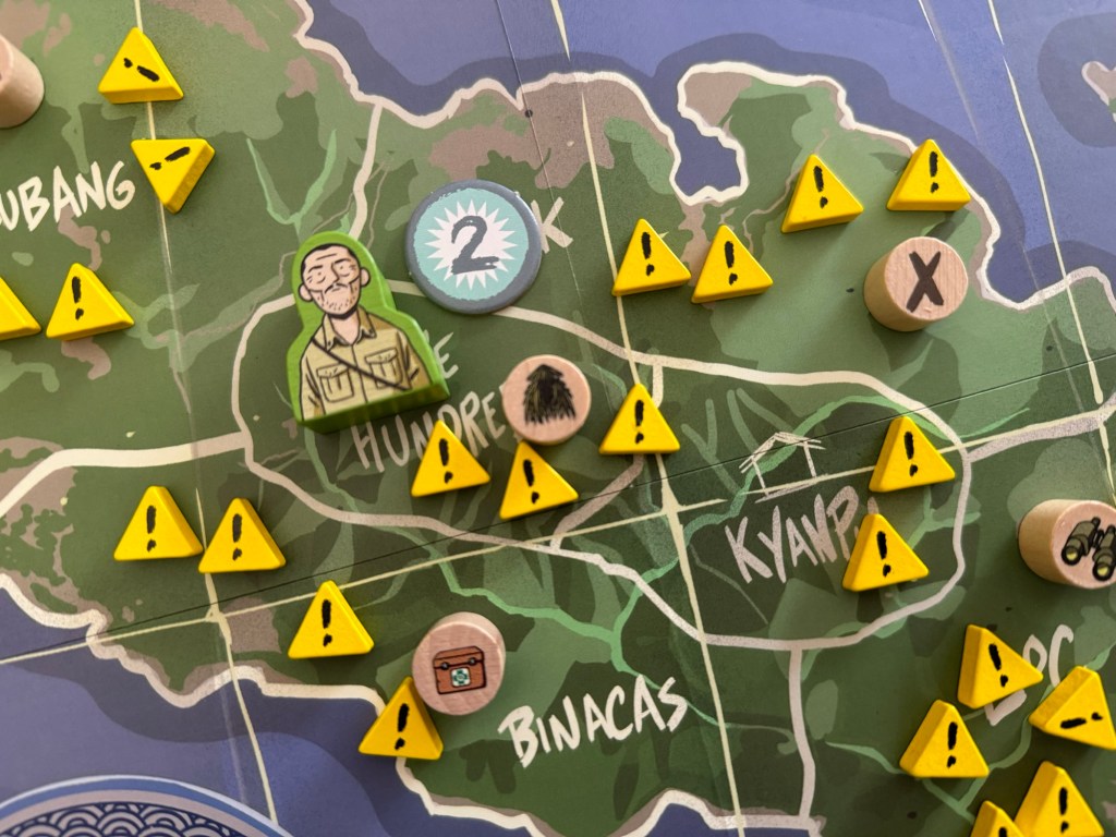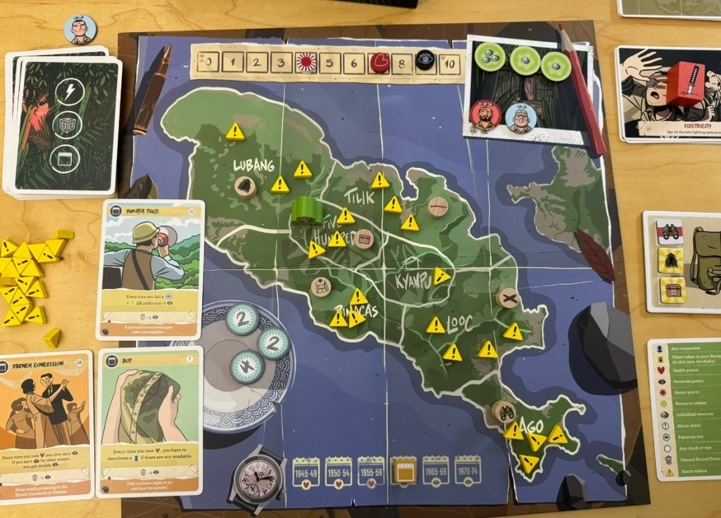 Francisco: Each 5 years is made into a round. A round has no fixed duration. Players can take actions with Onoda until they feel it’s too risky. They can pillage to get resources, they can do the mission of the round, move from one place to another one or try to repair their equipment. As they take actions, Alarm Levels keep increasing on the island in the spaces where these actions are taken and events (usually negative) happen. After they have done everything they can, they return to their camp and end the round only to start a new one.