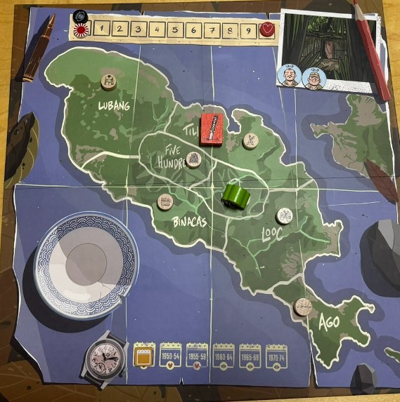 Francisco: This should be an easy answer but it’s really not. We could say that this game is about the thirty years that Hiroo Onoda spent in Lubang doing guerrilla warfare and thinking the WWII had not ended. But that’s not the main theme of the game. That’s simply the setting. The main theme in the game is resilience in the face of adversity. How to face a very difficult situation following the Japanese philosophy of Shoganai. Which doesn’t mean to accept everything that comes to you, but to understand that you can’t control fate and the only thing that is in your hands is how you react to what happens to you. But I always have liked movies, books and games that have a strong subtext. And this game has one that I didn’t want to explain and let players just discover it on their own.