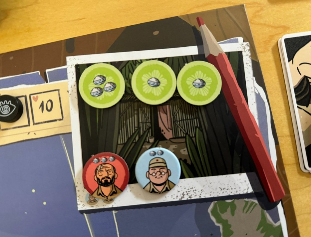 Francisco: The board is a a map of Lubang with its seven regions identified including Lubang, Tilik, Five Hundred, Binacas, Looc, Ago and Kyanpu. The tracks on the board are for Health, Paranoia and Mission Points. There is Onoda’s camp in the upper right corner, which is a place to set some pieces like your companions and gathered resources. And also, a place to leave your counters until the action ends (a rice bowl).