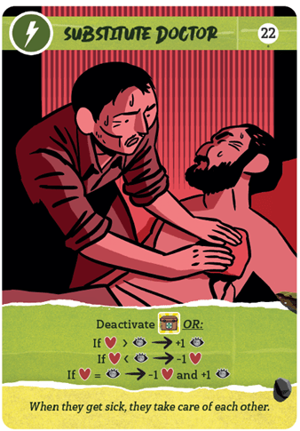 Francisco: This is an example of an Event Card called Substitute Doctor (Card #22). You will notice the lightning symbol in the upper left hand corner of the card which means this is an immediate effect event. In this Event, we talk about what happened when one of the companions got sick. They had to become makeshift doctors and nurses for as long as it took for their companion to recover their strength. The effect of the card is immediate. They must deactivate the Medicine asset if they have it available but if they are not able to do it, they suffer an effect according to the level of Health and Paranoia as compared with each other on the track on the board. As you can see, these kind of events tend to affect the mental and physical health of Hiroo and can even trigger an abrupt end to the game by causing the player to have to take a Paranoia Check.