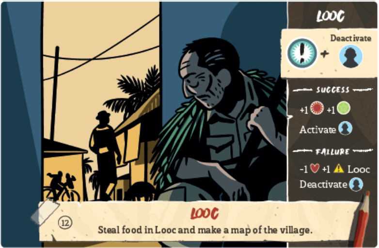 Here is an example of a Mission Card. At the bottom we can see where the mission takes place (Looc) and a small description of what the mission is. This was an effort to take food needed to survive but also to make a map of the village. On the right side you see what Onoda must do to succeed: namely an Alarm Check plus deactivating a companion. If he succeeds, he will get an Honor Point and one random Resource Marker drawn from the draw bag and he will recover his companion as well, even the one that was just deactivated to complete the mission. If he fails, he’ll lose one Health, add one extra Alarm Level to Looc and deactivate another companion (potentially causing the death of one of them).