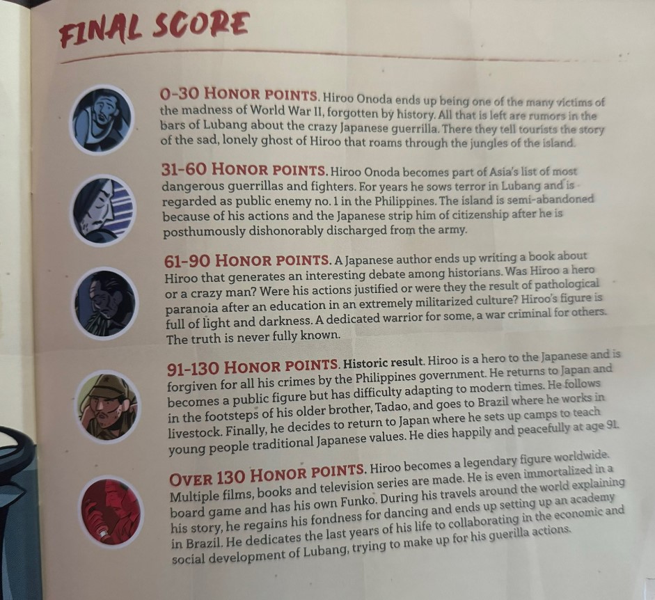 Francisco: Honor Points are Hiroo’s interpretation of what his Missions are. He believes that completing the Missions is what the Japanese army asks of him and that it earns him honor. When he succeeds at a Mission, the reward always includes an Honor Point.