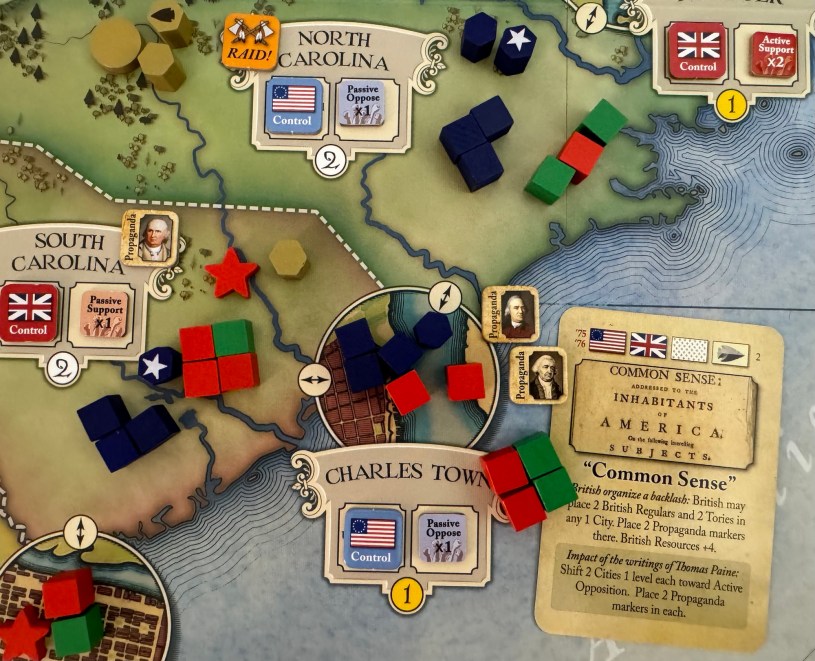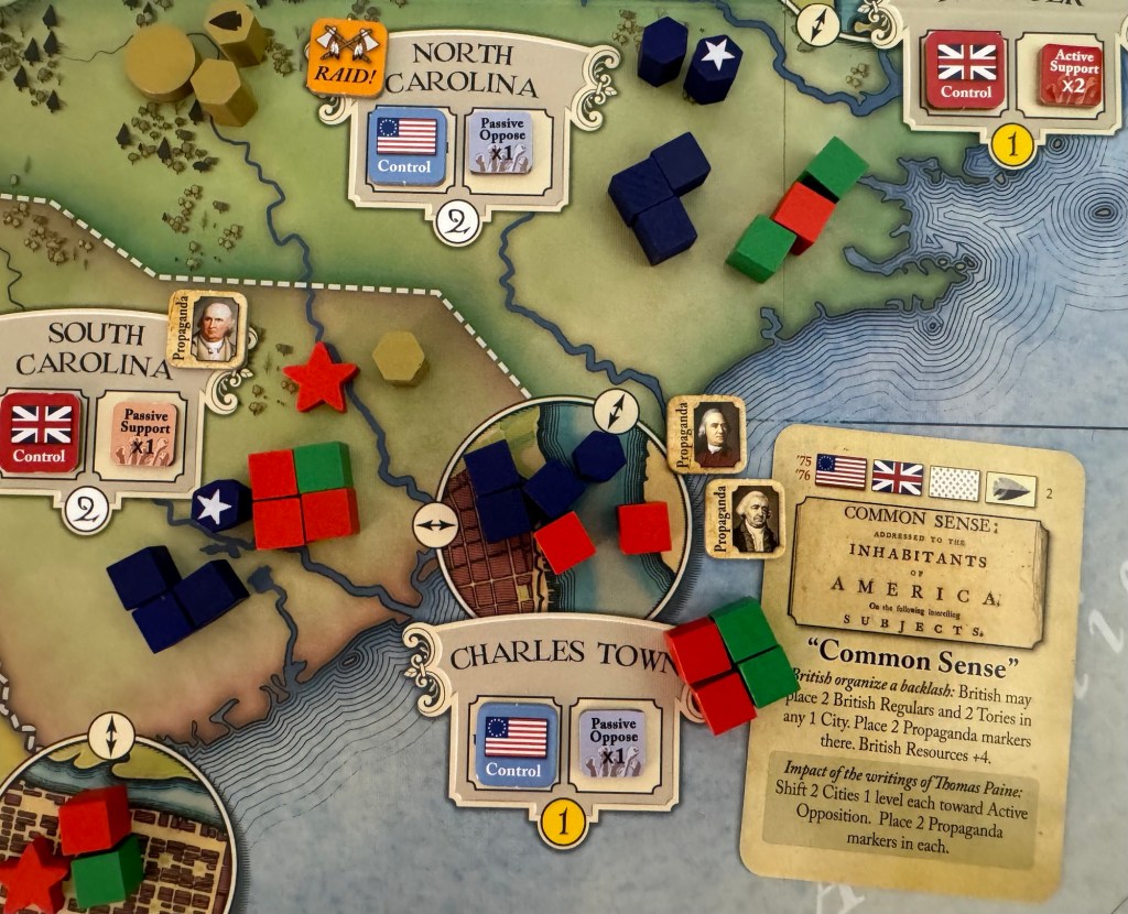 The bottom of the card is for the Patriots and drives home the true impact of the writings of Thomas Paine as it causes the shifting of 2 Cities one level each toward Active Opposition as the ideas really caused many to reconsider the issues and decide to be independent. But, the same as the top part of the card, the player must then place 2 Propaganda markers in each of the Cities. The Propaganda markers are not significant until either player decides that they wish to spend their resources to sway the space toward their side. For each Propaganda marker, the player will have to spend resources to remove them prior to being able to pay to shift toward either Support or Opposition. I love this thematic connection as either side will have to commit to this effort to really make any change and it will not be easy. This card, more so than many of the other cards in the game, really drive home the concept of the American Revolution being about the swaying and influencing the people’s hearts and minds and reinforce the famous quote by John Adams: “The Revolution was effected before the War commenced. The Revolution was in the minds and hearts of the people…” And I believe that this statement concisely summarizes the American Revolution.