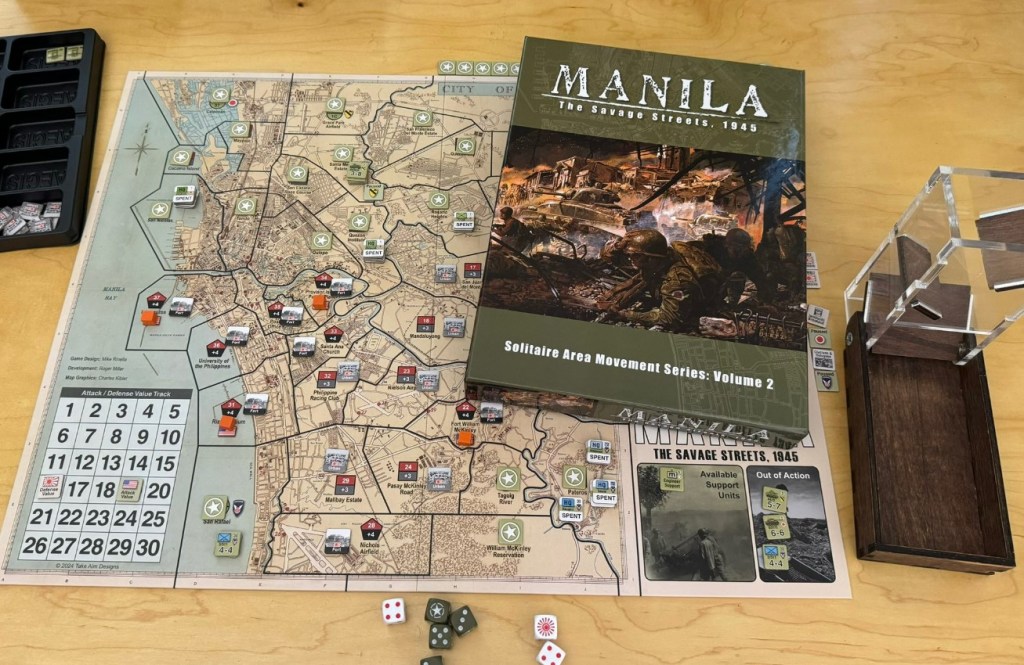 In 2023, I was expose to a very cool area activation/impulse solitaire wargame system designed by Mike Rinella called Stalingrad: Advance to the Volga, 1942. This game was a pretty big hit and they then began work on the follow-up effort called Manila: The Savage Streets, 1945. I have played this game many times this year and really love how it works and the narrative that it tells.
