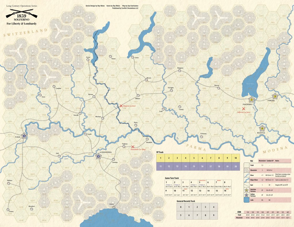 Ray Weiss with Conflict Simulations Limited is a bit of a lightning rod for some interesting things but he is a good designer and he always comes up with interesting looking games that tend to push the boundaries of design. This new Long Century Operations Series deals with various battles in the Second War of Italian Independence and the newest stand along game focuses on Risorgimento. This game is intended to be a standalone variant of the campaign game for the Solferino Quad, which is a separate game that you can purchase as well.