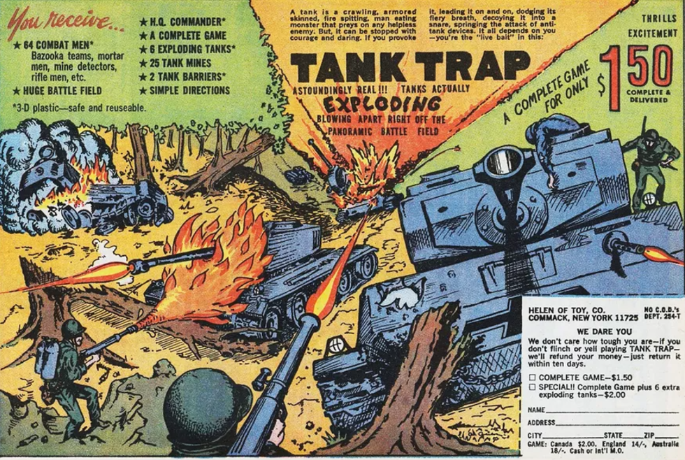 Wes: I used to make up games from as far back as I can remember. When we were playing “Army” throughout the neighborhood with about 10 of us kids, I was always the one making the rules regarding boundaries and how high you had to count with your eyes closed when you were “shot.” Then I discovered those Helen of Troy games on the back of comic books and ordered a few. Generally, they seemed to take forever to arrive (maybe they had a secret P10,000 system I didn’t know about?), and when they arrived they were rather chintzy. But I still sometimes consider buying a copy of Tank Trap off of eBay and have to stop myself. I remember their comic book ad that stated, “A tank is a crawling, armored skinned, fire spitting, man eating monster that preys on any helpless