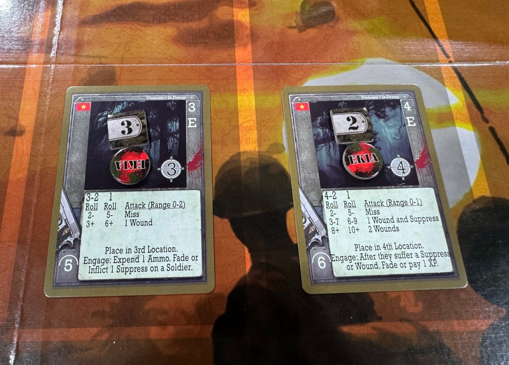 Another really great addition to the game is the inclusion of the Fade mechanic. Similar to the inclusion of Body County, this mechanic really represents the hit and run nature of the combat including ambushes and other tactics that are not necessarily a large scale stand up fire fight. During the Fade step of each of the Hostile Turns, Hostiles that have the Fade Keyword have the condition checked to see what effect it might have. If the condition listed on the Hostile Card is met, the Hostile unit will be discarded, and no additional Body Count or Experience is awarded. In fact, the player now loses the ability to continue hitting this possibly wounded and less effective enemy as they tucked tail and ran to the bush. Some of the Fade conditions have costs listed on the cards that require the player to have to pay those costs to avoid the unit from leaving the board. These costs can be paid to prevent the Hostile from Fading but is also a choice as you never seem to quite have enough of any resource, including Action Cards, Ammunition, Health, Experience Points and other things. In the example picture below, if there are no Soldiers present in the location where this Hostile is found, then it will Fade away.
