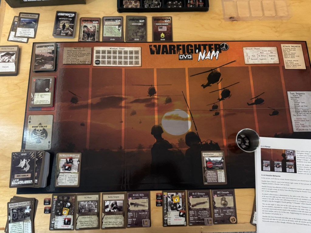 There’s been several iterations of the system over the years in their own stand alone products, providing you with different theatres, weapons, nationalities, etc. This year, they released off of a successful Kickstarter campaign the newest addition to the series in Warfighter: Vietnam. Well, actually, the title is Warfighter: The Vietnam War Special Forces Card Game but it is colloquially referred to as Warfighter Vietnam. To date, we have played 4 scenarios together cooperatively, with each of us controlling 1 Player Soldier, and I have also played a few scenarios solitaire in the comfort of my game room. I have very much enjoyed the experience and really want to share with you what new tricks the designers have added to capture the thematic feeling and atmosphere of the Vietnam War. This is not your father’s Warfighter! It has been given a total facelift, including new graphic design, art and card backs and that is not all as they have also added new Keywords, new enemy abilities and a whole new level of requirement for a successful mission. I want to share with you what is new in this First Impressions post and take inside the jungles of Vietnam as you fight the Viet Cong and North Vietnamese Army for control of the country.