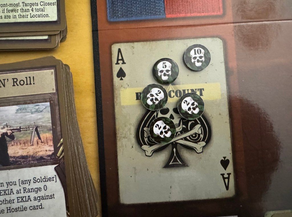 The Body Count in the game is earned by Soldiers whenever they cause an EKIA (Enemy Killed in Action) on a Hostile after a hit with a weapon. This Body Count is tracked with circular markers and held in the Body Count Box on the left side of the board and when an EKIA happens, the player must decide to either Bank the Body Count to count toward the required Mission Threshold or Keep it to be spent on special abilities during the Mission after the play of Action Cards. These Action Cards will call out the use of a certain number of Body Count held by the Soldiers, not those that have already been Banked, to activate certain abilities such as access to new weapons, equipment and ammunition from the bodies of the fallen enemy to other benefits such as increasing your Defeat Cover roll, which is required to actually confirm a hit on a Hostile unit.