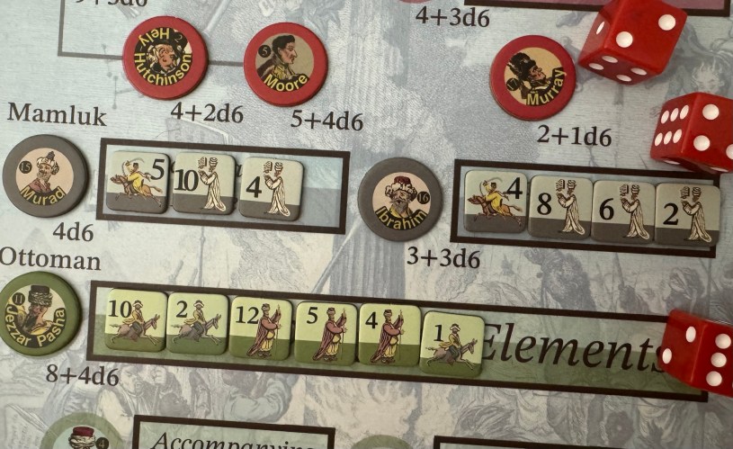 In Combat, each Infantry is worth 1 Strength Point, Cavalry is worth 2 Strength Points and Artillery are worth 3 Strength Points. So as you can see having Cavalry on your side in Combat is very important. In the above picture, you will see that the armies of Murad (left) and Ibrahim (right) have a total of 9 Cavalry between them (5 for Murad and 4 for Ibrahim) as well as 30 total Infantry units (14 for Murad and 16 for Ibrahim). Murad’s army has a total of 24 Strength Points and Ibrahim has 24 as well. These units are referred to in the game as Elements and the box they are located in is called the Accompanying Elements Box.