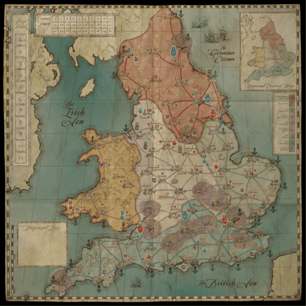 Unhappy King Charles is a 2-player game on the English Civil War (1642-1645) that pits the Royalists against the Parliamentarians in a battle for control over England’s regions and economic centers.