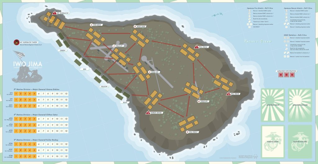Over the past couple of years, we have seen Worthington Publishing grow and expand as they are not only putting out more games, but these games are getting better and better, both in their play and also in their production value. A few years ago we covered several of their Kickstarter games and posted interviews on our blog including with Darin Leviloff (Soviet Dawn), Maurice Suckling and Dorian Richard (Hidden Strike: American Revolution), Hermann Luttmann (In Magnificent Style), Maurice Suckling (Chancellorsville 1863), Dan Fournie (Battle of the Bulge 1944) and Mike Nagel (Dawn of Battle). We played their Tarawa 1943 solitaire game a few years ago and it is just fantastic. Hard to win, brutal with its dice rolling, but a good and interactive solitaire game. Earlier this year they did a Kickstarter for the 2nd game in the Island Fighting Series called Iwo Jima 1945 and it is now ready for purchase.
