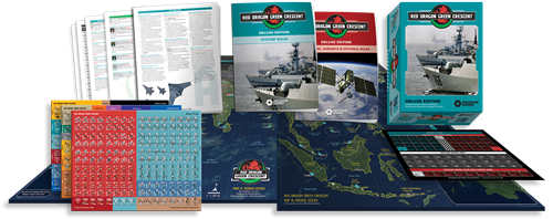 Red Dragon Green Crescent Deluxe Edition is a strategic-level simulation of hypothetical future conflicts in and around East Asia, the Indian Ocean, and the Middle East. The time frame is the not-too-distant future, roughly between 2024 and 2035. The game system is based on the proven CSR Award Winning design Red Dragon Rising (from S&T Magazine #250) and its sequel, Red Dragon Green Crescent (from Modern War #1), as well as variants which were published along the way. Red Dragon Green Crescent Deluxe Edition is a two-player game, adaptable to multi-player and solitaire play, with three primary scenarios allowing for play on either map or a combined game across both.