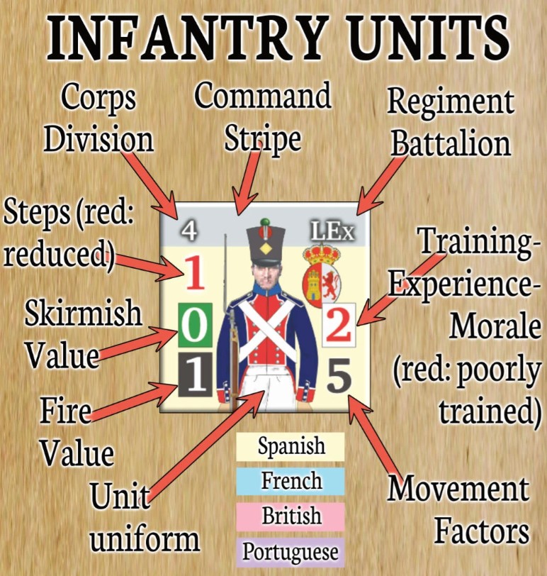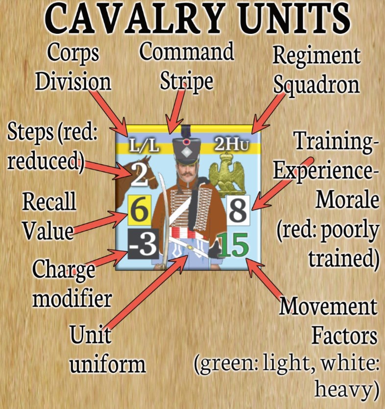 Frederic: Combat units have 5 primary values printed (some classes have less): a step number (manpower), a combat value (fire or infantry or artillery, charge for cavalry), a movement factor, a training/morale/experience value (used to take morale/skill checks) and a “special” value (skirmish for infantry, range for artillery and recall for cavalry). The unit’s official uniform features prominently in the center of the counter. A color coded identifying command stripe is at the top, along with the unit’s man and affiliation. Leaders are the same except that they have a command radius (instead of a special value) and a strategy rating (instead of a combat value).