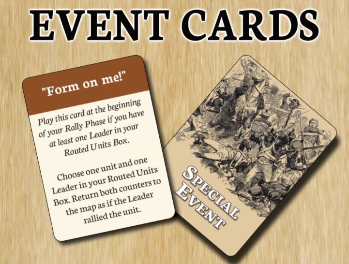Frederic: Event Cards were introduced to add a little “fun flavor” to the game. A player that rolls badly (a natural 9) is “compensated” by being allowed to draw an Event Card that he can play now or later. These cards give a player the one-time opportunity to bend game mechanics to their advantage. Examples are: automatically passing a morale check, automatically implementing an order, achieving a better melee or fire result, etc.