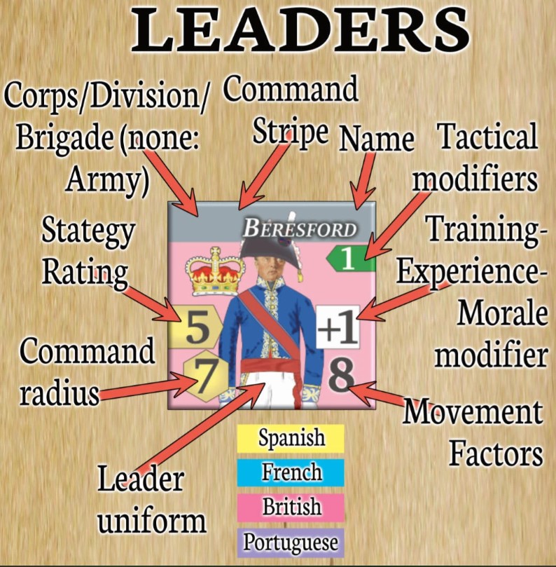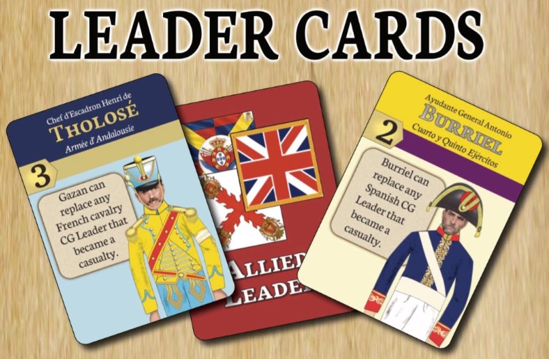 Frederic: The cards are “mini-cards”, with a generic back for each side. They show the Leaders’ full name and rank, his command stripe color, his strategy rating, his uniform and a possible text outlining special rules for that Leader.