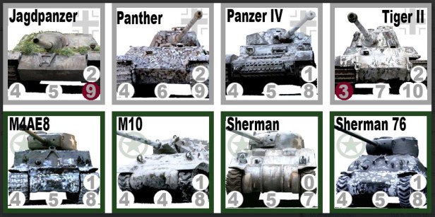 Matt: The counters contain 4 pieces of key information: the movement points, the armour value, the normal range of its primary weapon and the penetration bonus of that weapon.