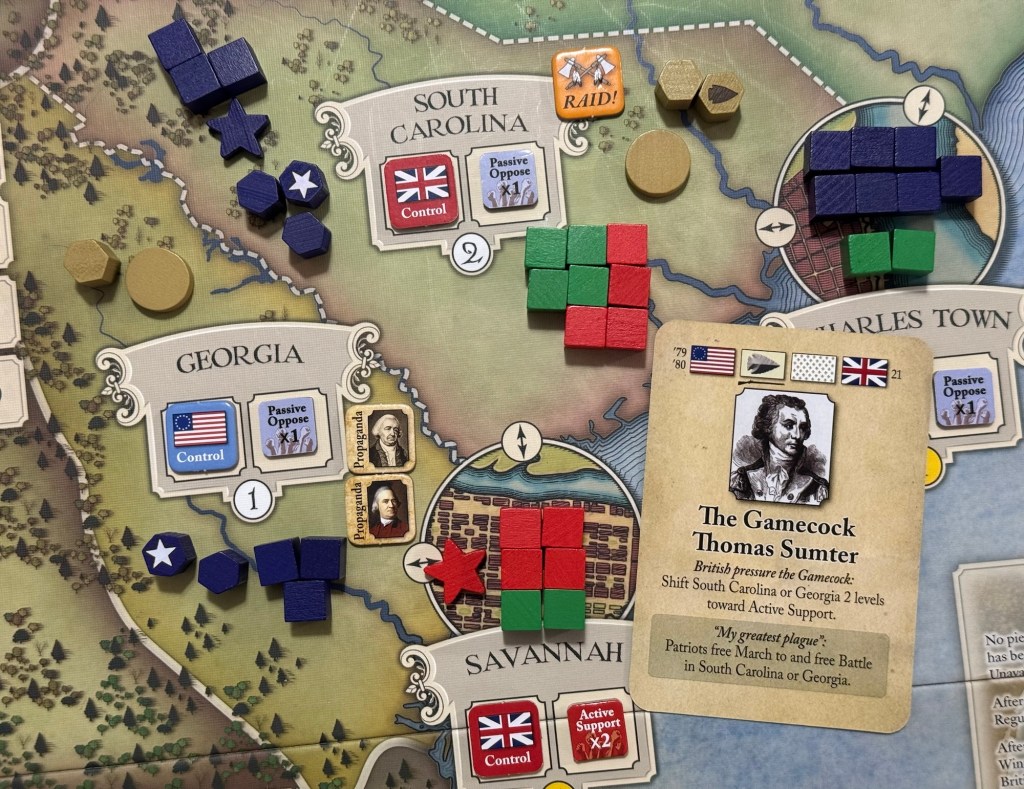 The Gamecock Thomas Sumter is such a card for the British, as when it is played for the Event, the British can shift South Carolina or Georgia two levels toward Active Support. This is a major tool to be used here and should be strongly considered by the British player when this event comes up.