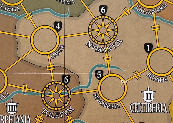 There are a few limitations to this Move though as a Praetor cannot move into or through a City that is currently in revolt (has a black disc located in the circle). The Praetor can move to a Sea Space from a city or another Sea Space but only if that target space currently has a Fleet located in it. Fleets can only move over the Sea and if they are carrying a Praetor they move with the Fleet as it moves. There are also road segments (signified by a gray block like line) drawn on the board located in the Roman Provinces of Citerior and Ulterior. These Roads facilitate more efficient Roman movement across the Links and can see the Roman Praetors moving along the entirety of the Mediterranean Coast from east to west with only the cost of a single Denarii if all of the Road segments are connected. These chained roads are very important and it is wise for players to place their limited road pieces in order to maximize their movements as they cannot afford to waste too much time moving about the board. There are revolts to put down!