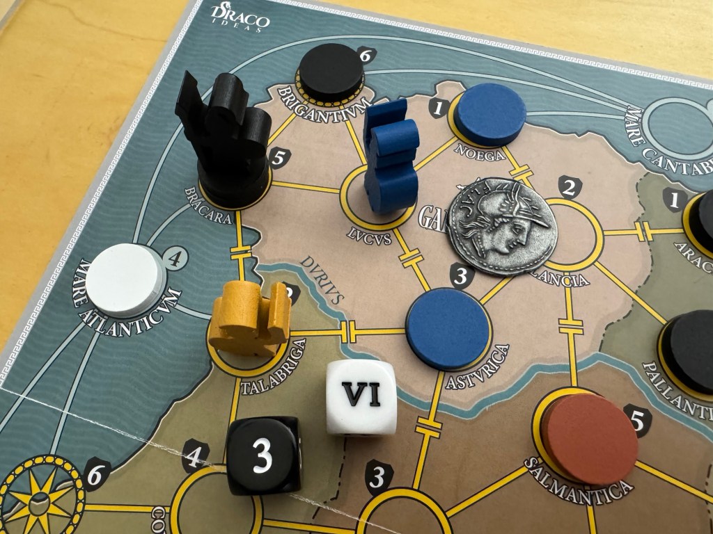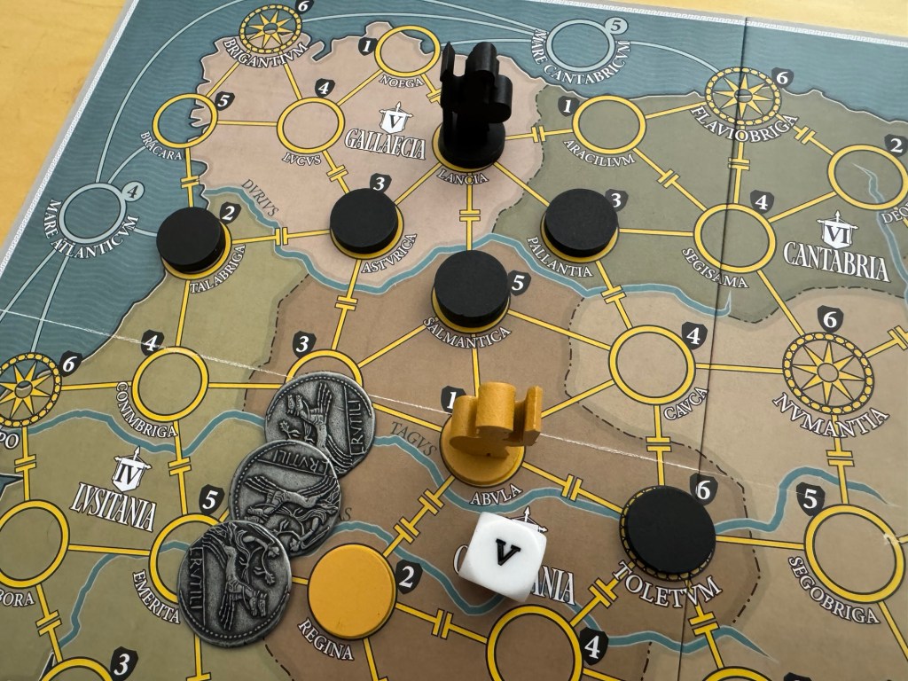The Roman player rolls a VI (6) while the Barbarian rolls a 3. This means that the Roman Total Attack Value is 18 (+3 (+2 for the Garrisons + 1 for the Denarii) added to the roll of 6 and then doubled) and the Barbarian Total Attack Value is 6 (+1 from the lone Revolt in Brigantium and +2 from the 2 Revolt discs in Bracara added to roll of 3). This means that the Roman Consult wins this battle and will get to remove the Barbarian Army piece as well as the 2 Revolt discs located in Bracara. A great victory and the Consul will most assuredly be transported back to Rome to receive the praise of his Emperor and the people.