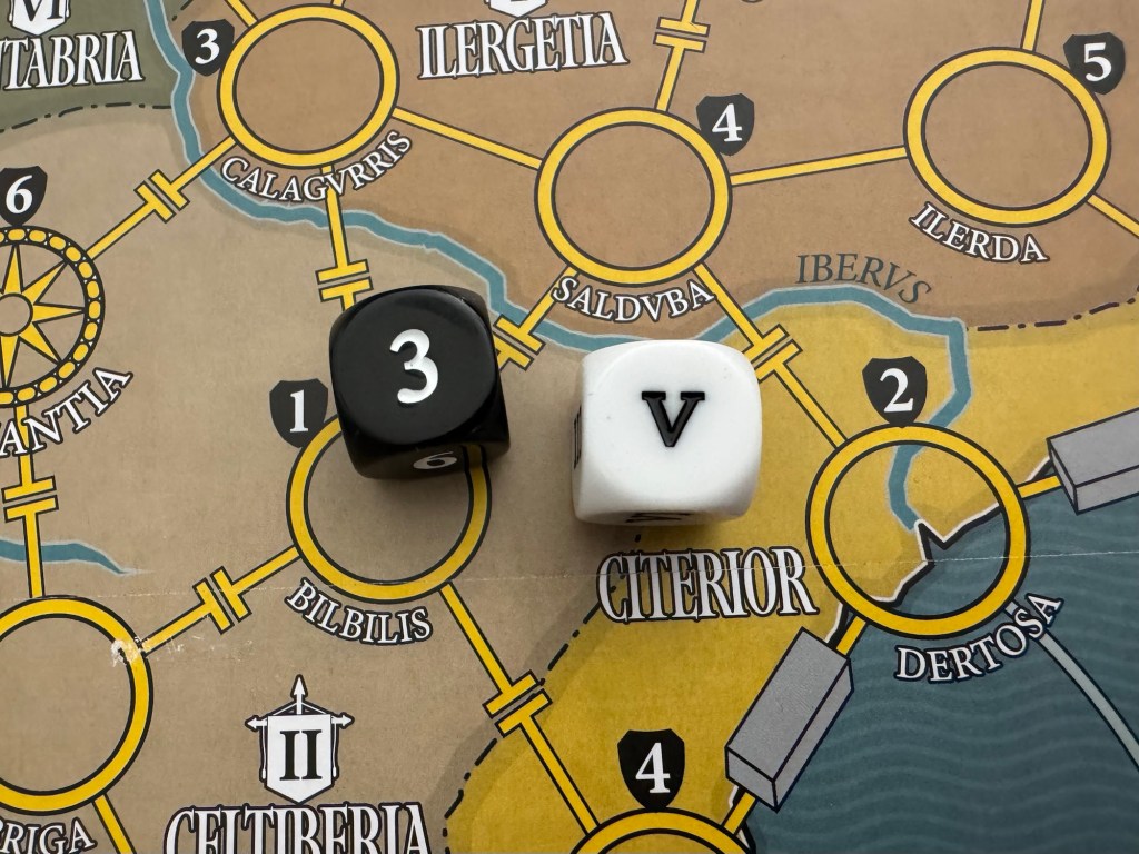 One note about the white Roman die. It is a standard 6-sided die but uses Roman numerals rather than numbers or pips. It has results from 1 (I) through 6 (VI) and will also be used by the player during the Hispanic Phase to roll along with the black die to determine where a revolt will spring up.