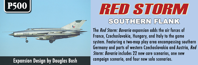 Red Storm: Southern Flank includes two full expansion modules—one covering southern Germany (Red Storm: Bavaria) and one covering northern Italy and Yugoslavia (Red Storm: Adriatic). Together, these two expansions greatly expand the original Red Storm game, providing players new air forces, with unique aircraft types and variants, and adding aircraft to air forces already represented in the original Red Storm game.