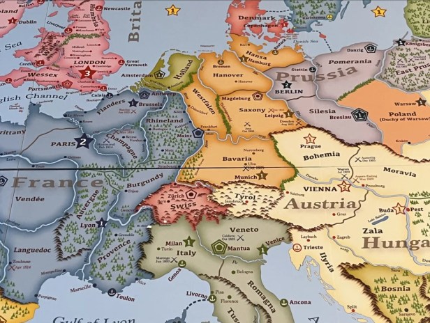 The game also comes with 8 sets of colored blocks including blue (France), red (England), yellow (Spain), white (Austria), black (Prussia), green (Russia), orange (Ottomans) and brown (Non-Player Empires). Once these are set up on the board it really is a sight to see! Tons of vibrant colors really create a feeling of excitement and interest and the game is very pretty to look at! There were no player aids…which in our humble opinion is a crying shame! As mentioned earlier a 2nd set of rules would have been helpful.
