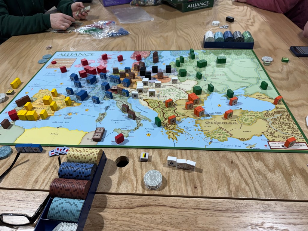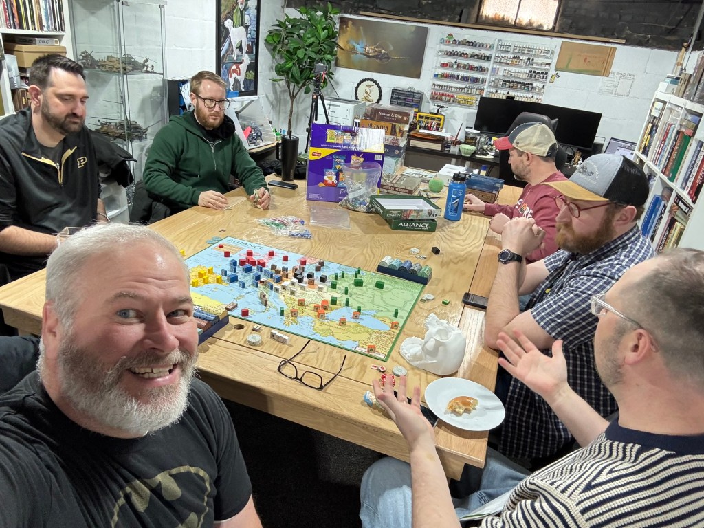 I really enjoyed our experience with Alliance this past weekend. We invited 5 friends over to play with Alexander and I including Mike Heckman (from St. Louis), Russ Wetli and Jacob Garis (from Lafayette, IN), David Thompson (yes the designer David Thompson of Valiant Defense and Undaunted fame!) and his friend Chris Blackford (Dayton, OH). 7 friends, sitting around a table, negotiating, making and breaking alliances, laughing, yelling, disagreeing, lots of dice rolling and trying desperately to keep our blocks hidden from prying eyes. The game took us 5 1/2 hours for a 4 turn scenario and all had a good time. There was a lot to like. But the game wasn’t perfect and I think that we all felt like the bones were good but it needed a bit more meat.