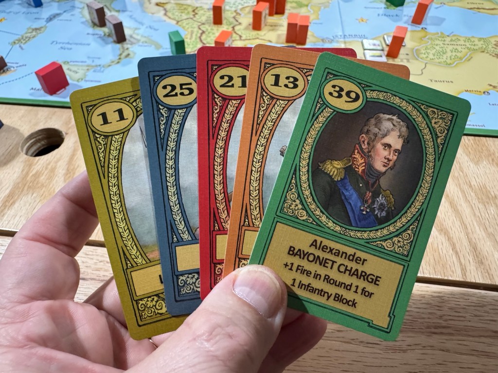 First off, the game is best played with 7 players. This is a big game and the really great element here is the negotiation, treaty making and breaking and the alliances that will form. This requires a certain type of gamer to be done well. Someone that is willing to push the boundaries of negotiation, really dig in and come up with proposals that benefit all sides. Thinking outside the box. I don’t like it when players negotiate like they are the be-all-end-all and if you don’t do all that they want then they throw their hands up and then come at you. Everything is up for negotiation and deal making, including peace, cessation of hostilities, ceding territory, allowing other nations to enter your lands without conflict, giving gold, making loans, etc. with the exception of cards. You can’t give a card to someone, because the cards are what set the turn order each turn. I would have liked to see the ability to swap out cards. For example, there are leader cards for each of the nations and they do give the player a nice ability but leader cards also allow for a diplomacy check to be initiated with the various neutral minor powers called Non-Player Empires or NPE’s found around the board. These minor powers are key to anyone’s empire building goals as they are a source of Victory Points that come without direct conflict and the risk of the dice betraying you and losing your important units. Levying new units onto the board is not easy and the players only get 3 (or 4) Action Points to use to build up armies, add new armies or move those armies to initiate combat.