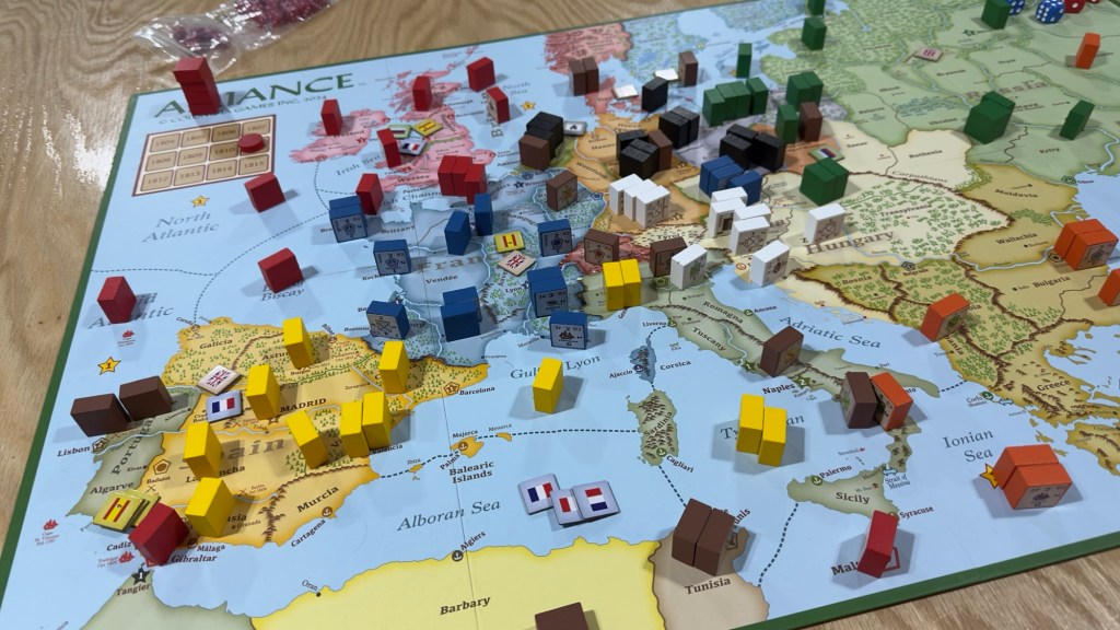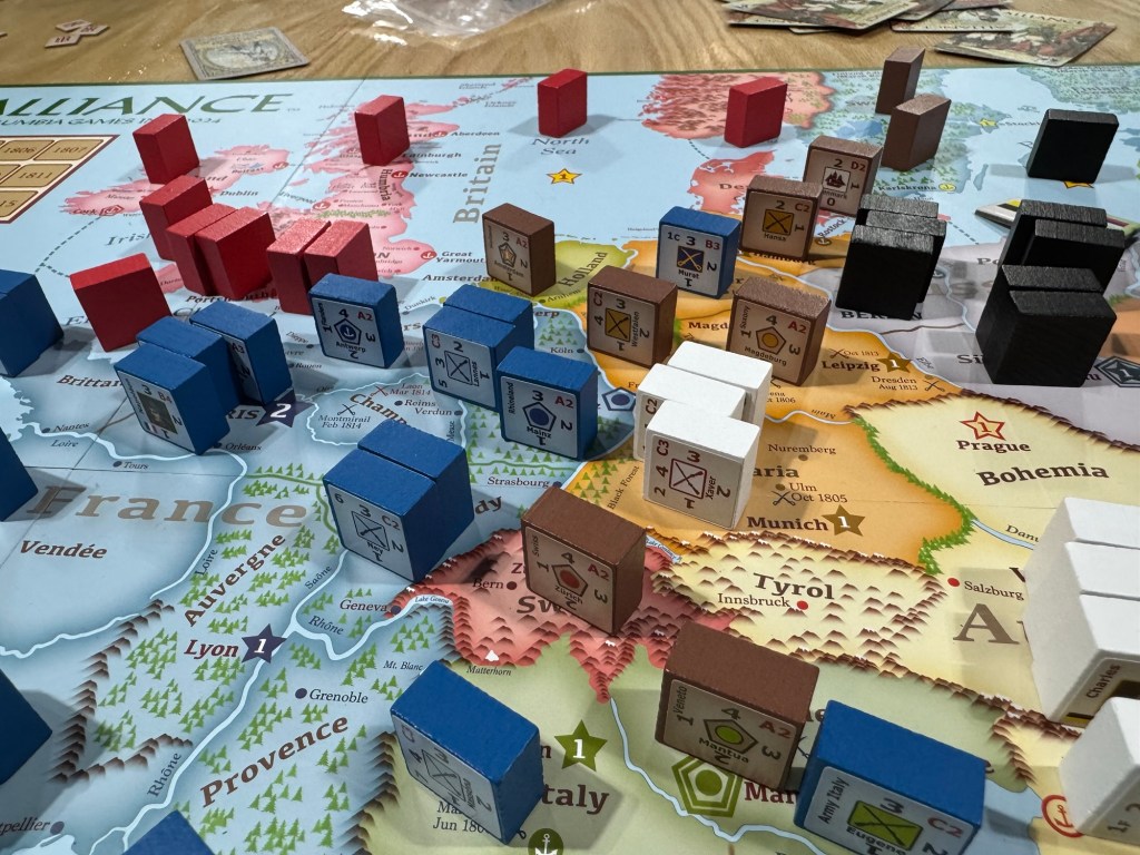 As you know, we very much enjoy multi-player wargames and anytime there is a new multi-player game coming out we very much sit up and take notice. In early 2024, Columbia Games launched a Kickstarter for a game on the Napoleonic Wars called Alliance: Multiplayer Napoleonic Wargame. Alliance is billed as a 1-7 player strategic level game of diplomacy and warfare in the Napoleonic Era with a Columbia Block System twist. The game is huge and plays best with more players. The players take on the roles of different nations during the time and you can play as Austria, England, France, Prussia, Russia, Spain, or the Ottomans. We recently played a full 7-player game and had a grand old time. While the game is not perfect, and there are some quirks that you must get past, the game is really pretty fun and interesting and could be one of those main staples at gaming conventions where you need a lot of players. I want to share my First Impression thoughts on the design and give you a good idea about how the game plays.