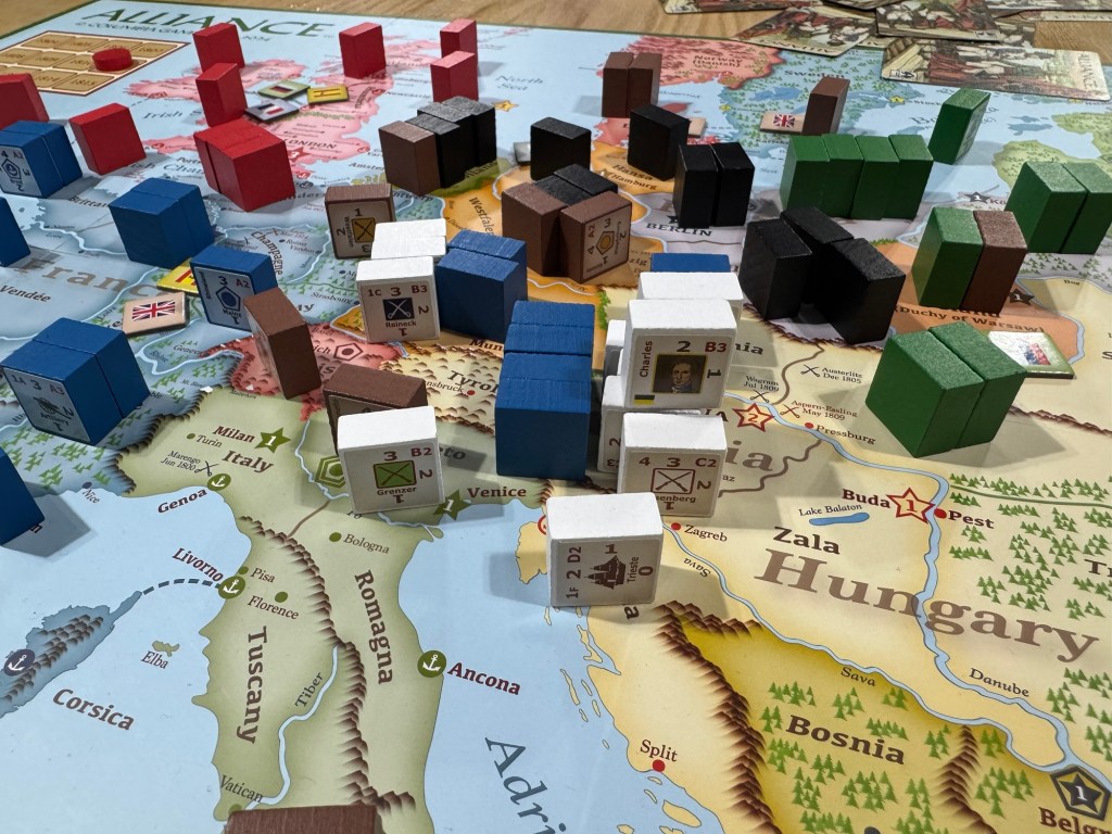 I do like the map for this Alliance: Multiplayer Napoleonic Wargame. I also really like the blocks. I’ve never played a block wargame, before, but I have loved the sight of them, ever since I first encountered them a number of years back. While you routinely dip your toes in the gaming waters of many different wargames, Grant, some of us remain relegated to a state of relative banishment (self-imposed though it may be).