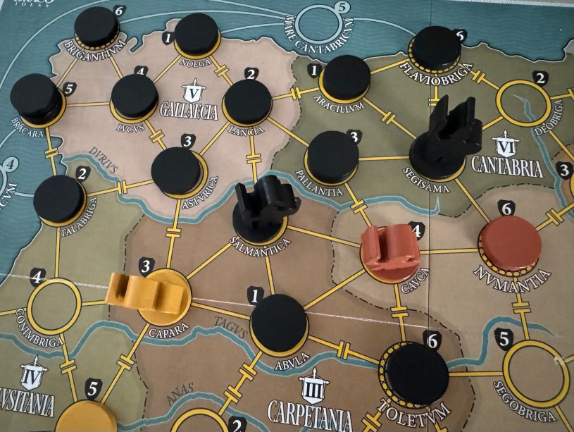 Each of the Provinces shows a Roman numeral in the middle of a white banner, which is used to determine the locations for random Hispanic Revolts at the end of each player turn or a total of 3 times per game turn. Ulergetia is number I, Celtiberia is number II, Carpetania is number III, Lusitania is number IV, Gallaecia is number V and Cantabria is number VI. These Provinces are further delineated by 1 of 6 cities in each whose number can be found in the black shield icon above their circle. Although these Provinces in Hispania did not have formal capitals at the time, the game calls the most important city of each Province the “capital”. These capitals are always denoted by a 6 in the black shield icon.