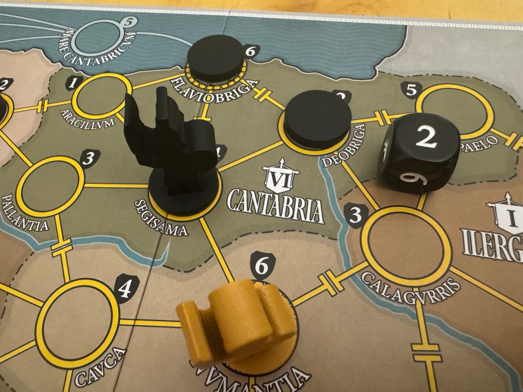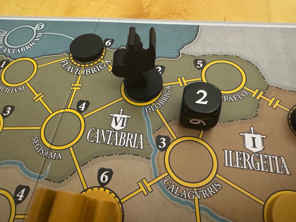 Because there are 2 choices, we must roll the black Hispanic Die. We roll a 2 and then must compare this number to the Shield Value of the 2 cities. In this case, Pompaelo has a Shield Value of 5 and Segisama has a Shield Value of 4. We compare the die roll of 2 to the Shield Values of both cities and whichever is closer to the rolled number is the choice for the Army to move to. In this case, 4 is closer to 2 than 5 is so the Hispanic Army will choose to move to Segisama.